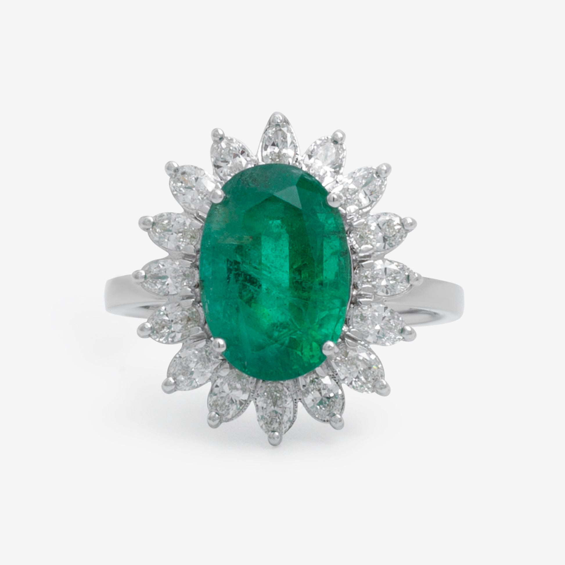 White Gold ring cast in 14K is BIS Hallmarked studded with Marquiese shape Diamonds weighing total 1.05 cts 16 pcs adn Oval Shape Zambia Emerald weighing 6.5 cts
